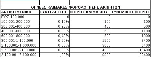 Από εκεί και πέρα, η κλιμάκωση θα ανεβαίνει προοδευτικά για να φτάσει τα 3.400 ευρώ για περιουσία έως 1,1 εκατομμύριο ευρώ και 20.400 ευρώ το χρόνο για περιουσία αντικειμενικής αξίας 3,1 εκατομμυρίων ευρώ.