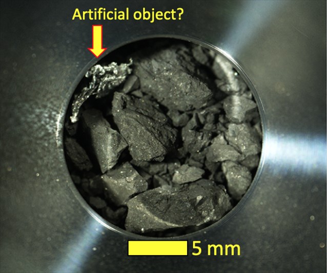ένα «τεχνητό υλικό», η προέλευση του οποίου μελετάται, ωστόσο, σύμφωνα με τη JAXA, πρόκειται μάλλον για κομμάτι αλουμινίου που προήλθε από το όργανο λήψης δειγμάτων όταν εκτοξευόταν βλήμα για την πρόκληση αναταραχής στην επιφάνεια του αστεροειδούς ώστε να συλλεχθεί το υλικό.HAYABUSA2.JAXA